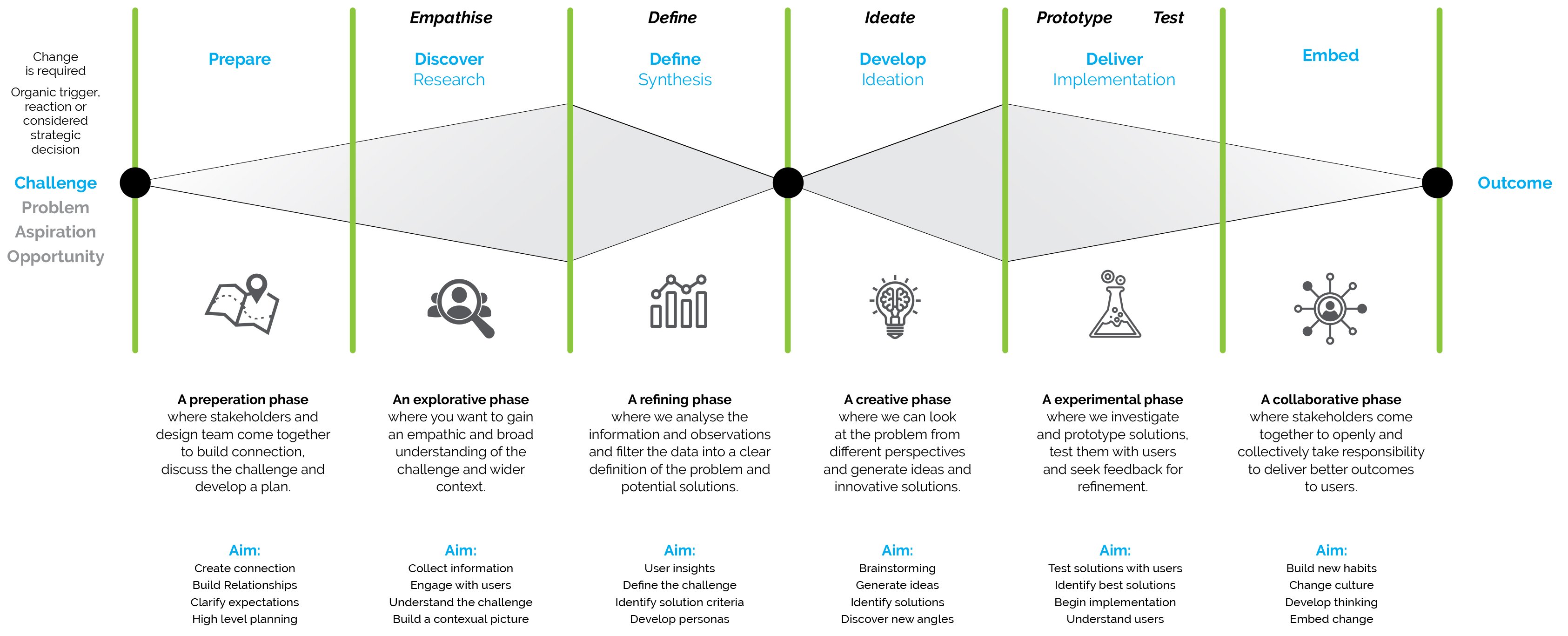 Below is a visual explanation I made based on the models from Interaction Design Foundation and the British Design Council.