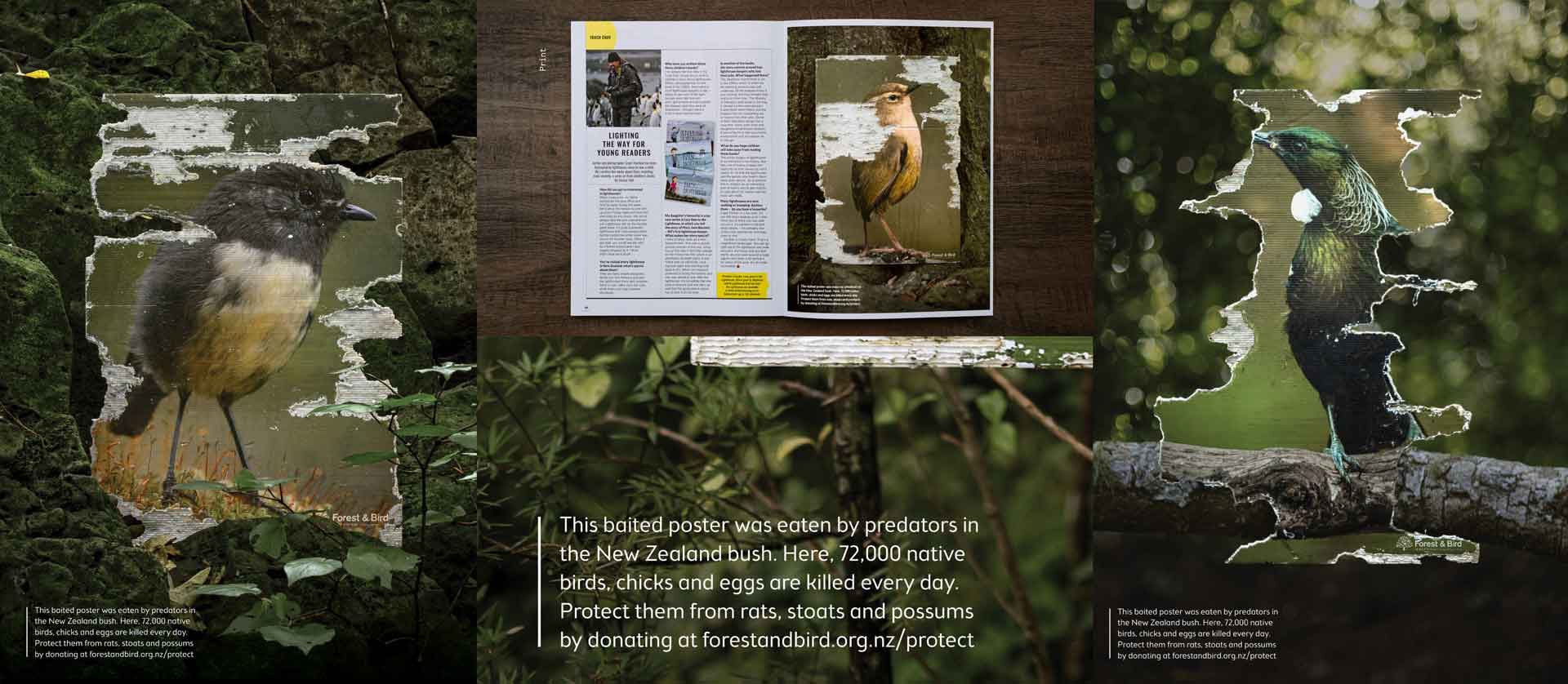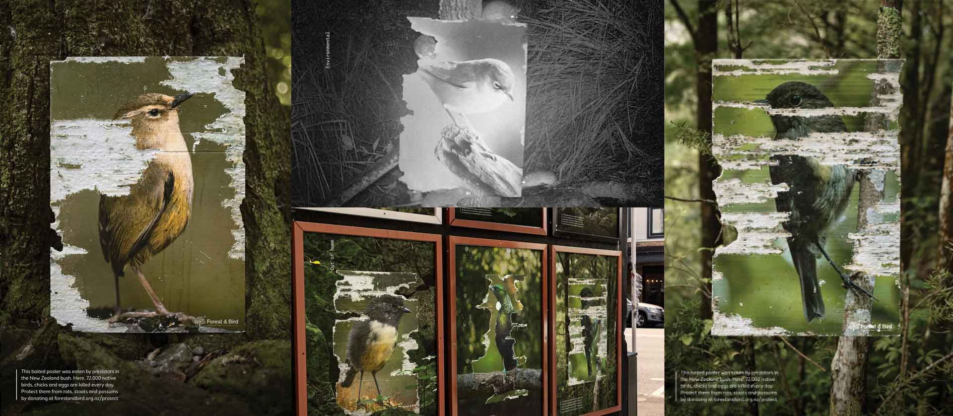 In partnership with ColensoBBDO and Forest & Bird, we created a series of native bird posters. These posters were printed on the same edible corflute used to detect which predators are prevalent in forest areas. Bird pheromones were applied to the posters to attract predators, and they were left in the New Zealand bush to endure the same attacks our native birds do. The remains were photographed.